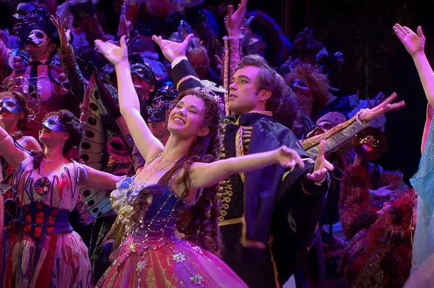 乐团奏出序幕组曲,宏伟气势转为婉转低吟,台上殷红厚重的幕帘向两旁退去,神秘阴暗、美丽动人的爱情故事就此开展。