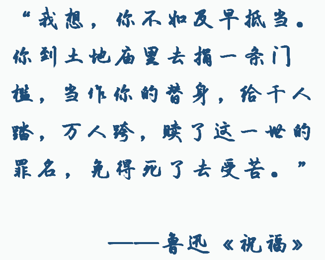 祥林嫂虽然是鲁迅笔下一个虚构的人物,但却是那个时代底层苦难百姓的缩影。鲁迅如此安排祥林嫂的遭遇,有他要揭露封建礼教和社会毒辣凶残的用意。他引导人们的目光转向整个掌握封建话语权的阶级,唤醒被压迫被剥削的人们。这确实实践着他理想中的“救人”。 但底层无学识的祥林嫂和大众,真的能凭己力摆脱封建枷锁吗?自赎自救焉知不是另一条“门槛”呢?