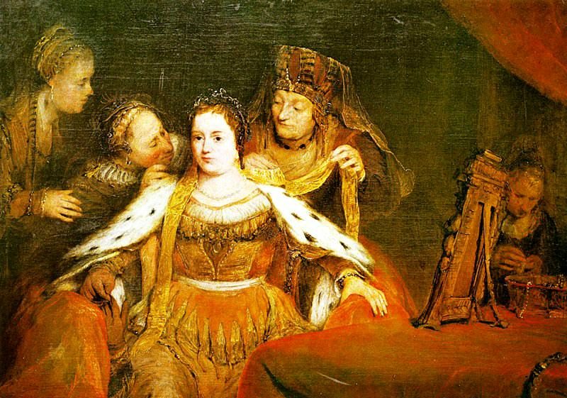 对面是我的义女,王后以斯帖。是出类拔萃的女子,是犹大的希望。当我们得知王要灭绝我族的消息时,我撕裂衣服,禁食哭泣,头蒙灰尘,痛苦哀号。以斯帖秘密会见我,说担忧我的现状。我劝说她为族人争战,她陷入了沉思。