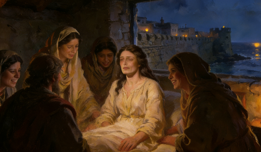 我走上吱嘎作响的楼梯,推开房门,一股哀伤与死寂迎面而来,沉重得令人屏住呼吸。房内的窗户半掩,微弱光线斜斜地落在床榻上。姊妹静静地躺着,面容安详,仿佛只是睡去。她曾照顾的寡妇们围在床边,手里抱着她缝制的衣袍,不停哭泣。